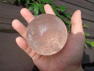 ヒマラヤ水晶球(ロック・クリスタル)です。 細かい気泡が多く、本来はクリアーだけど霧の中のよう。75ミリという大きさの存在感はバッチリです。 こちらの写真の登頂部分にレインボーがあります。 日差しを少しずらして掲げた一枚。手にするとこんなふうです。 インド・クル渓谷(ヒマラヤ山脈)産