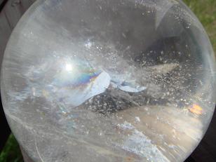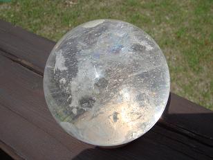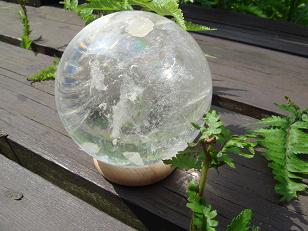 レインボ−・ヒマラヤ水晶球(ロック・クリスタル)です。 朝日を受けて 少し動かすだけでまるでオーロラの様に姿形を変えていきます。 抜群の透明度 ウッドデッキの隙間から生えてきている 陽を透かしてみるとこんな感じ。ヒマラヤの壮大なエネルギーを感じるこのクリスタル球。 インド・クル渓谷(ヒマラヤ山脈)産